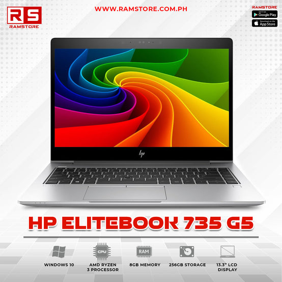 Elite HP EliteBook 735 G5 with AMD Ryzen 3, 8GB RAM, 256GB SSD, Full HD IPS display. Perfect for creative professionals & multimedia work.